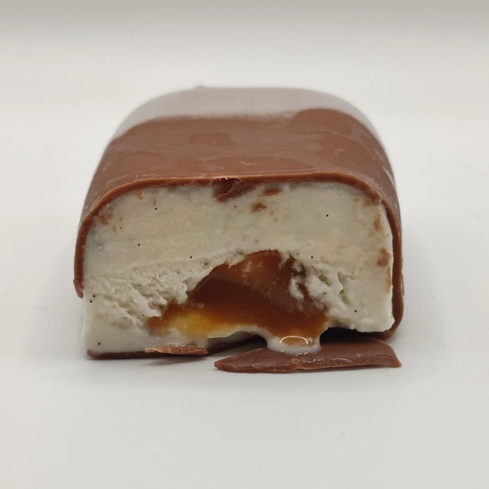 Une gamme de bâtonnets givrés vient de sortir du laboratoire ! Après plusieurs semaines de travail, voici le premier né de notre série. Découvrez le mariage très gourmand de la glace vanille pure gousse (gousses locales) avec un cœur fondant caramel, et un enrobage croquant chocolat au lait. Toujours 100% artisanal.